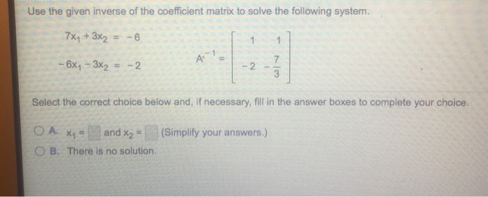 7 x 1 3 x 2 6. The coefficient matrix is beginbmatrix4-215endbmatrix To find the inverse use the formula A-11over ad-bcbeginbmatrixd-b-caendbmatrix Then multiply this inverse matrix by the vectors to find the answers. Then to the right will be inverse matrix.