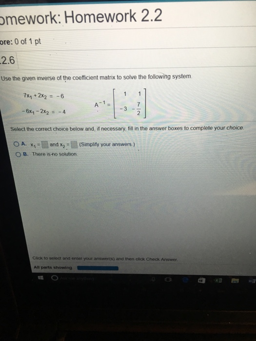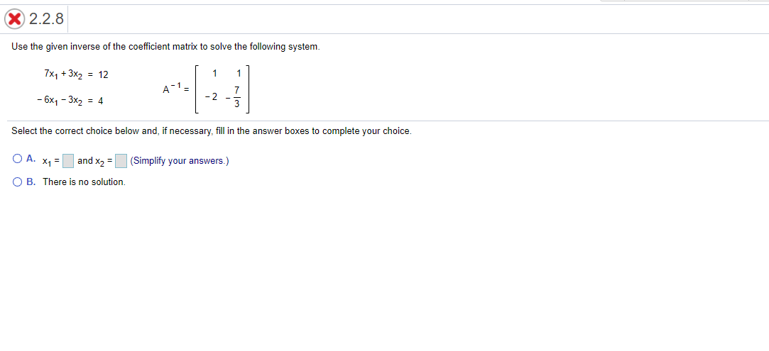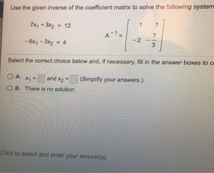 0A X1 and X2 Simplify your answers There is no solution. For instance you can solve the system that follows by using inverse matrices. X 1 x 2 x 3 x 4.