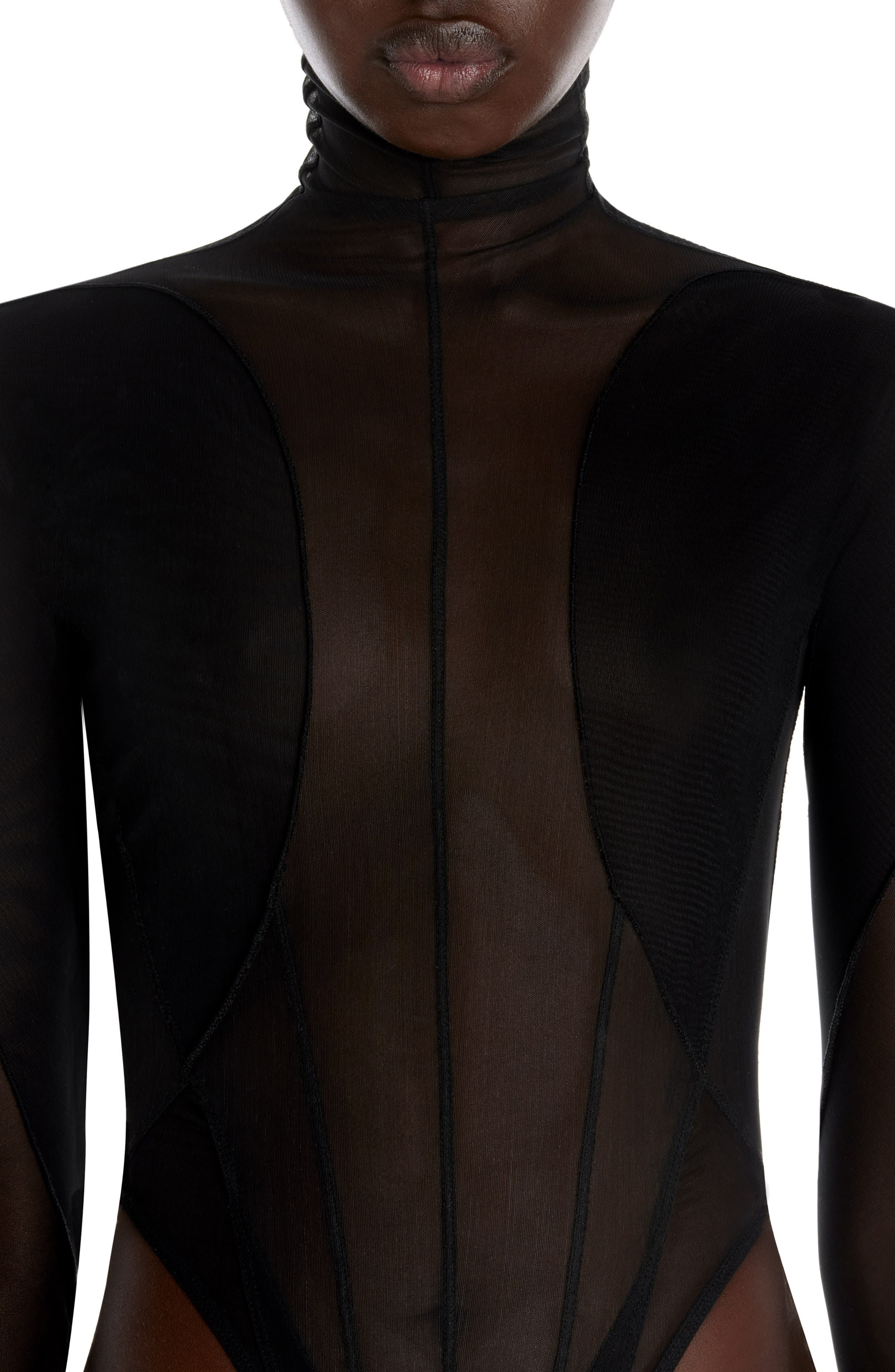 Norma Kamali Illusion Mesh One Shoulder One Piece Swimsuit. Thierry Mugler Illusion Mesh Long Sleeve Bodysuit 700. Thong style rear coverage.